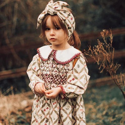 The perfect long-sleeved dress for the upcoming season. Sewn from beautiful cotton fabric. The dress has a gorgeous hand-painted floral print with an incredible hand-smocked chest part. It has a super comfortable and generous fit.