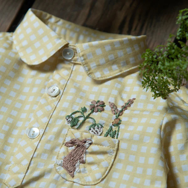 Introducing our charming boys' shirt, a perfect blend of playfulness and sophistication. Featuring a whimsical bunny motif on the front pocket, this shirt adds a touch of character to any ensemble. The practical yet stylish addition of neck buttons ensures easy dressing, making it a versatile and handsome choice for your little one's wardrobe.