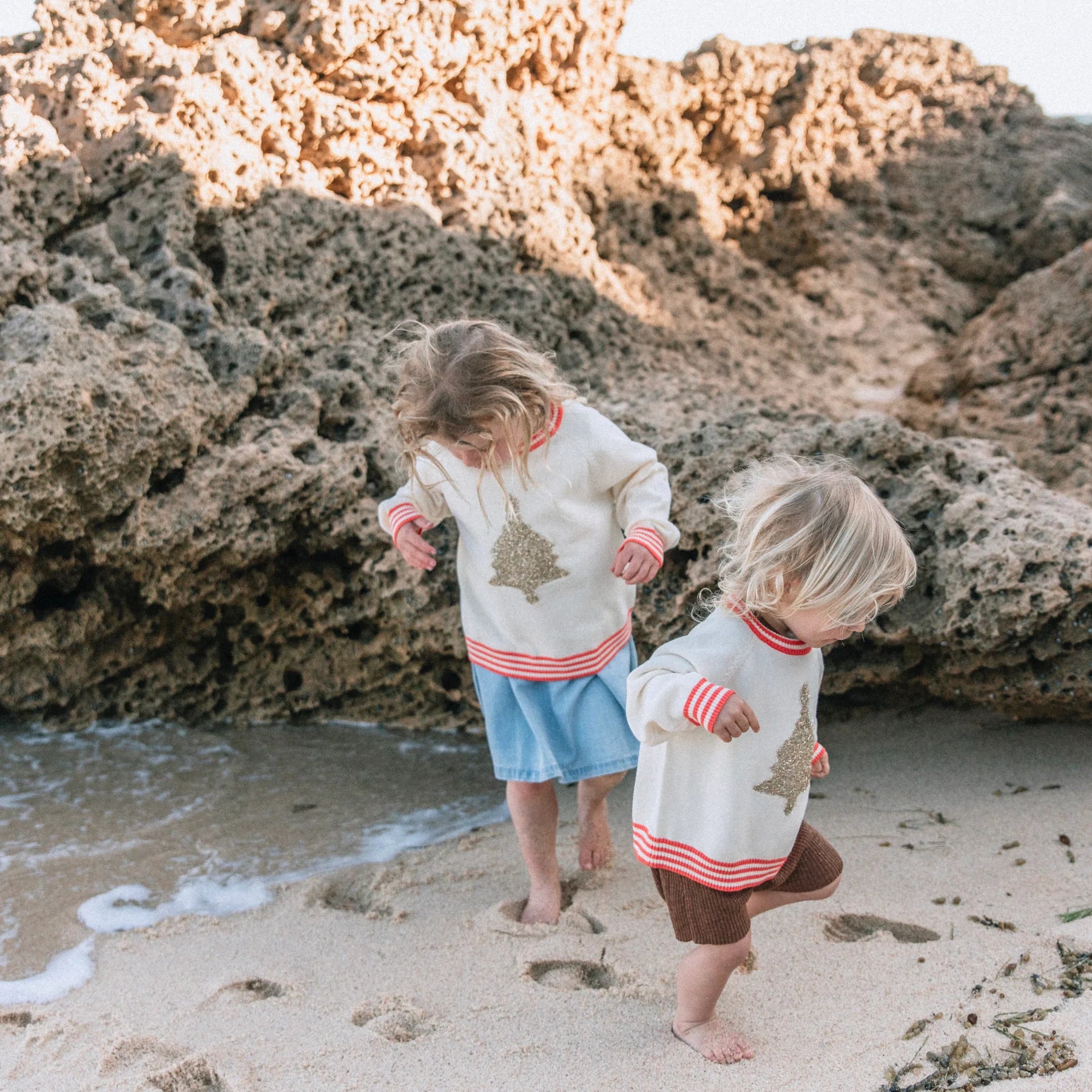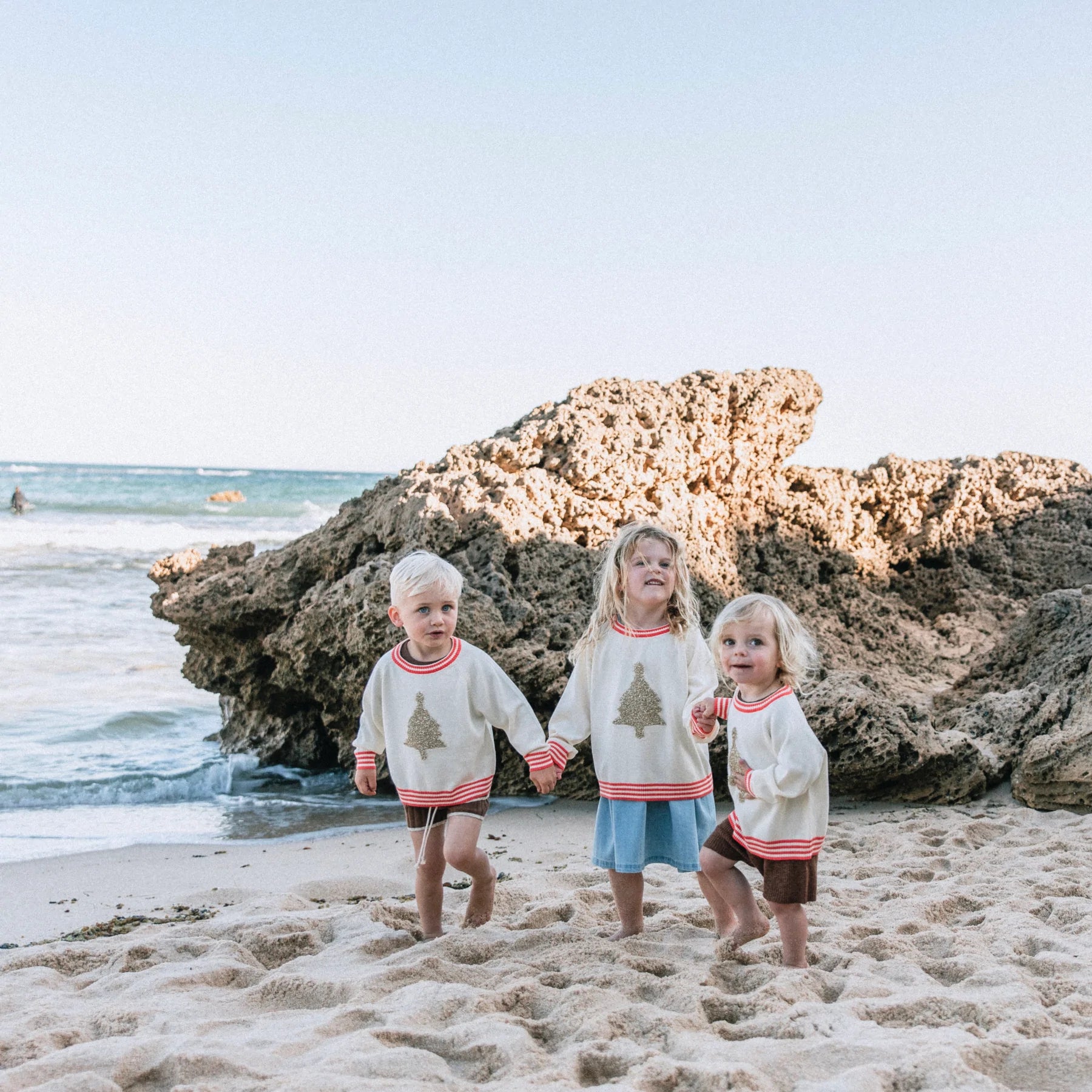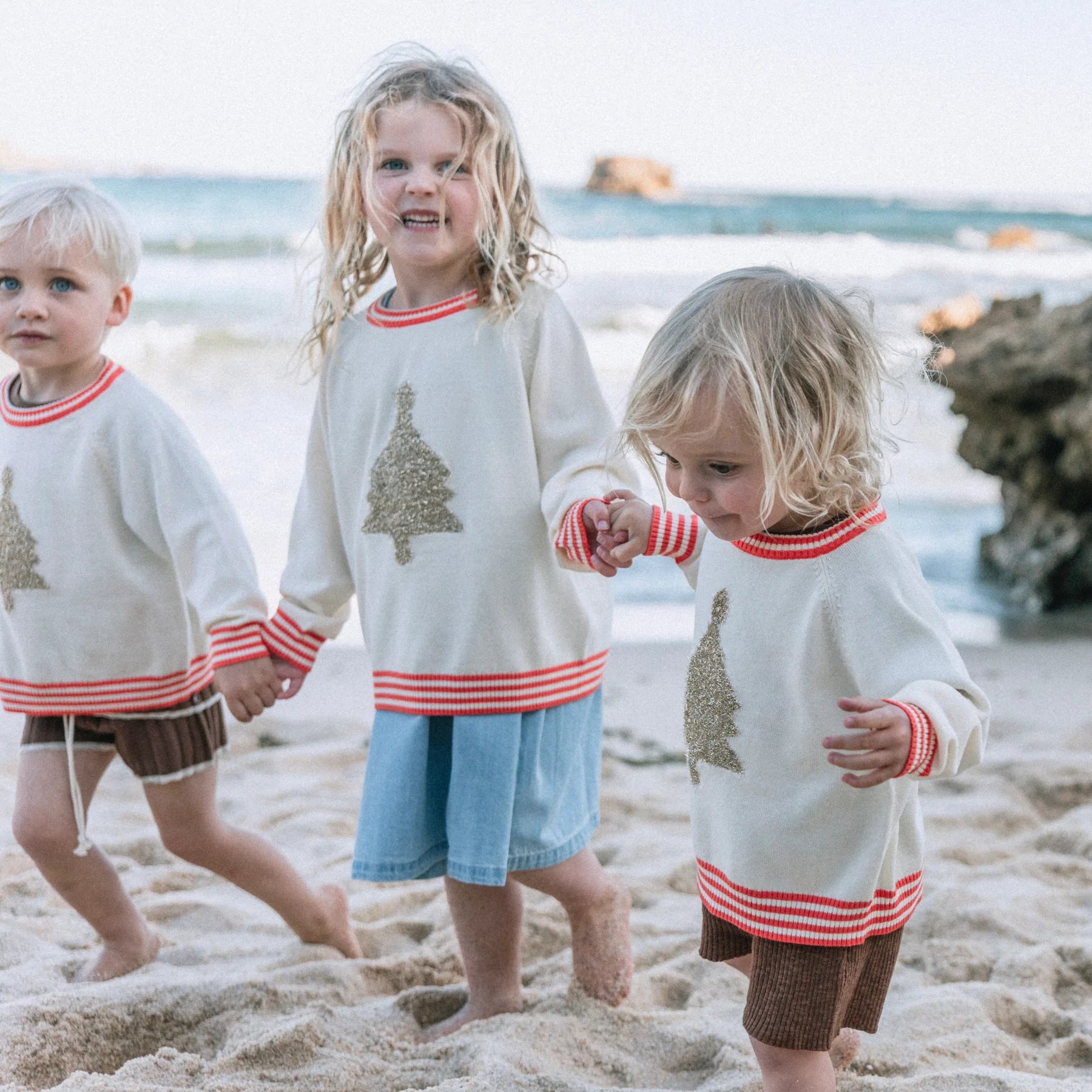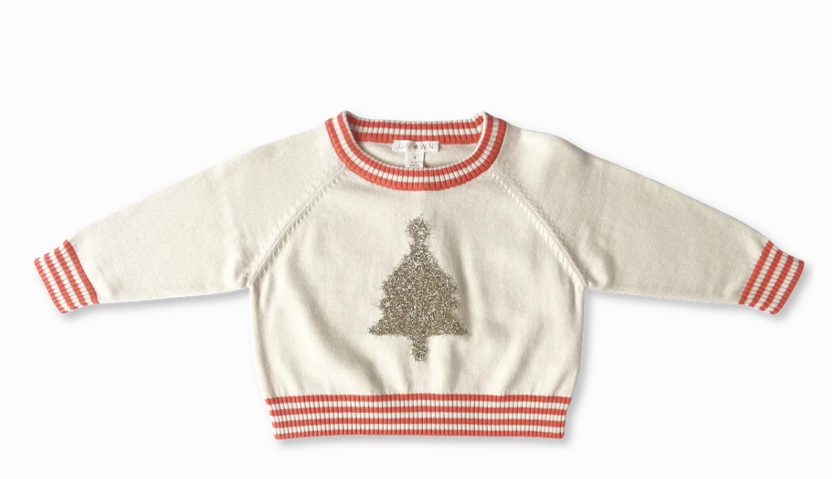 100% organic cotton with metallic nylon trim. Lightweight knitted jumper. Features a raglan armhole and a fluffy metallic neck band with a red stripe detail. Super cute for your minis first Christmas or matching family photos.