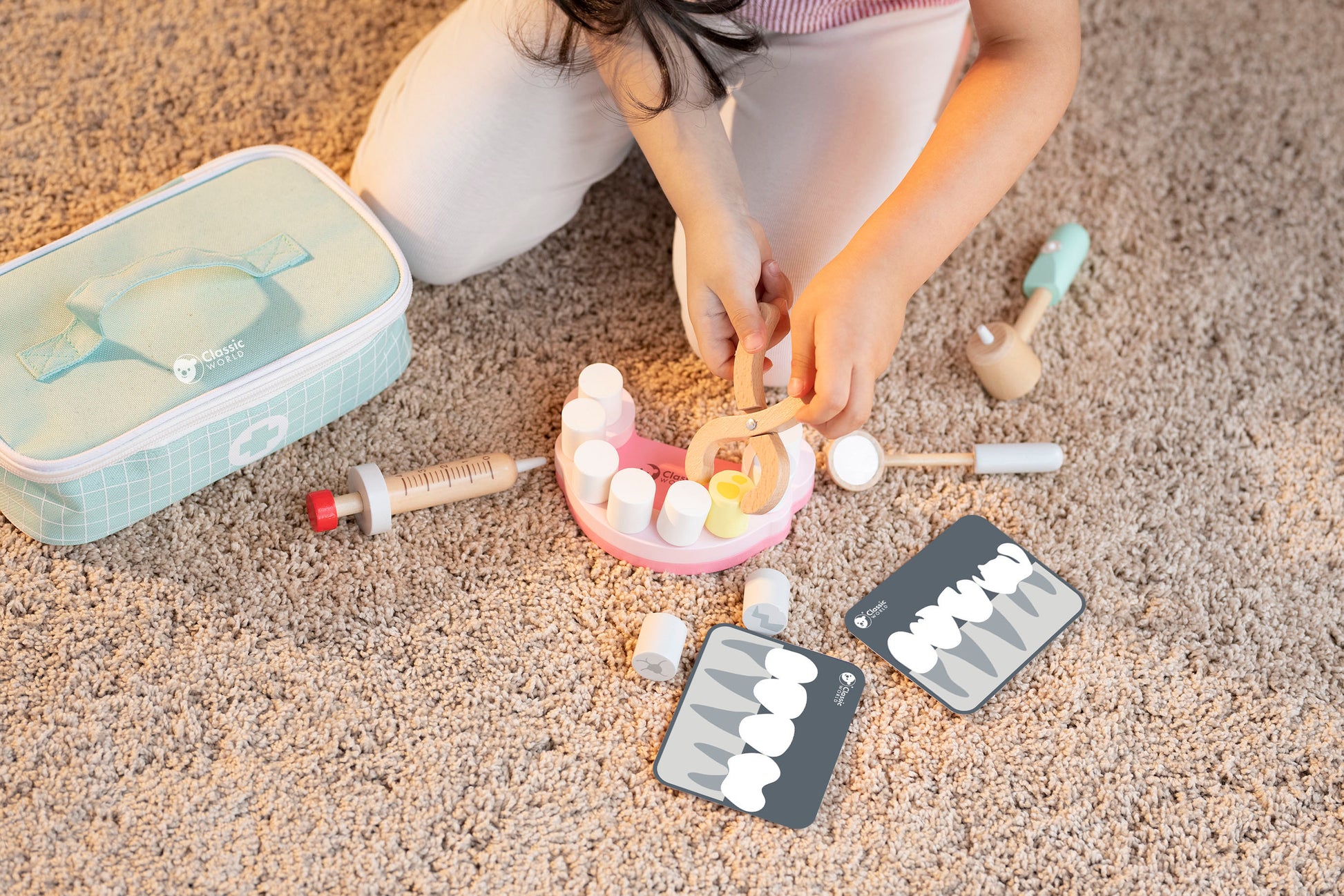 Let's play "Dentist Games" and have fun! This product includes 4 dental tools, 2 X-ray cards, 8 teeth in a holder and 2 extra teeth, and a bag for storing all of the accessories. During play, children can improve their imagination and ability to solve problems.