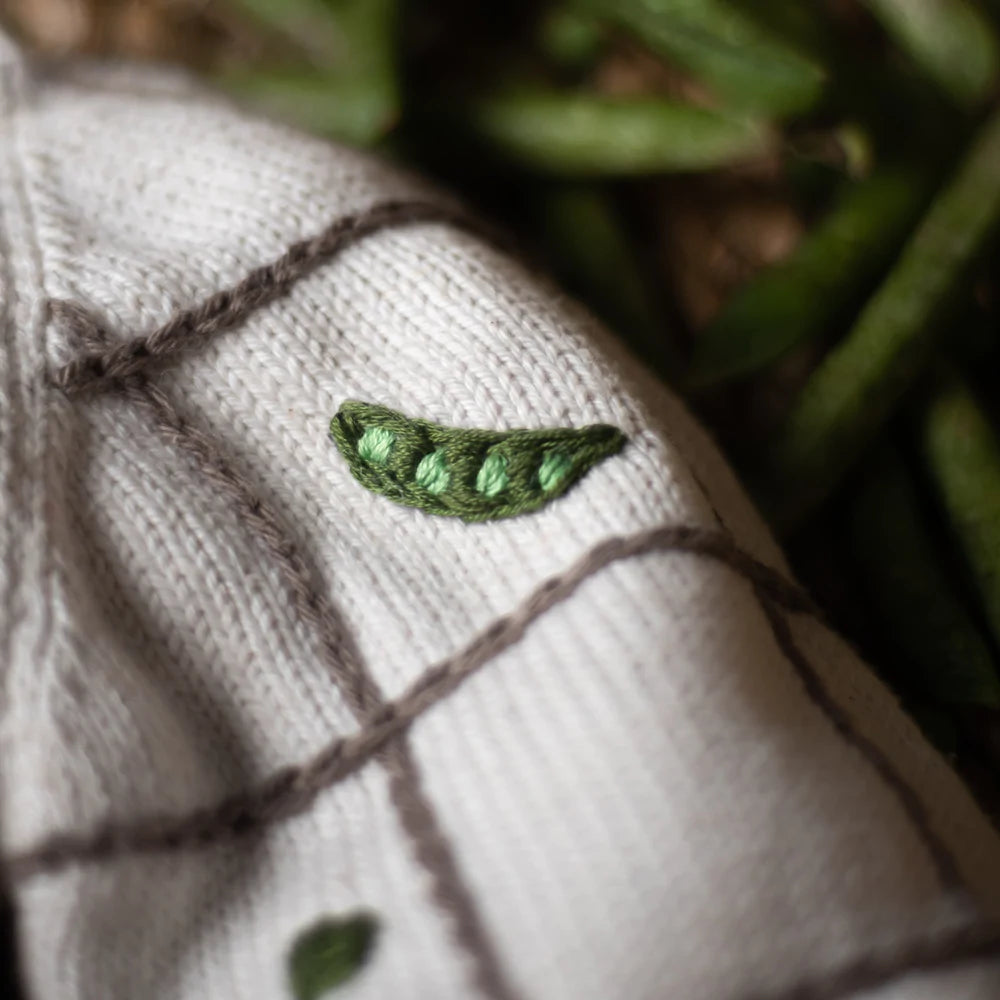 The embroidery is walk through a vegetable patch garden; a mix of peas, carrots and root vegetables <3.