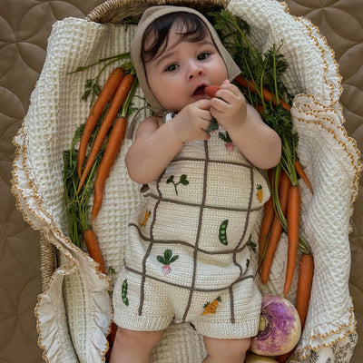 DREAM romper! This piece is made entirely by hand, and the gorgeous craftsmanship really shows. You will be receiving a true one-of-a-kind romper as no two items are 100 % alike. Children will love to explore the garden veggies and it makes for the sweetest Spring and Summer outfit.