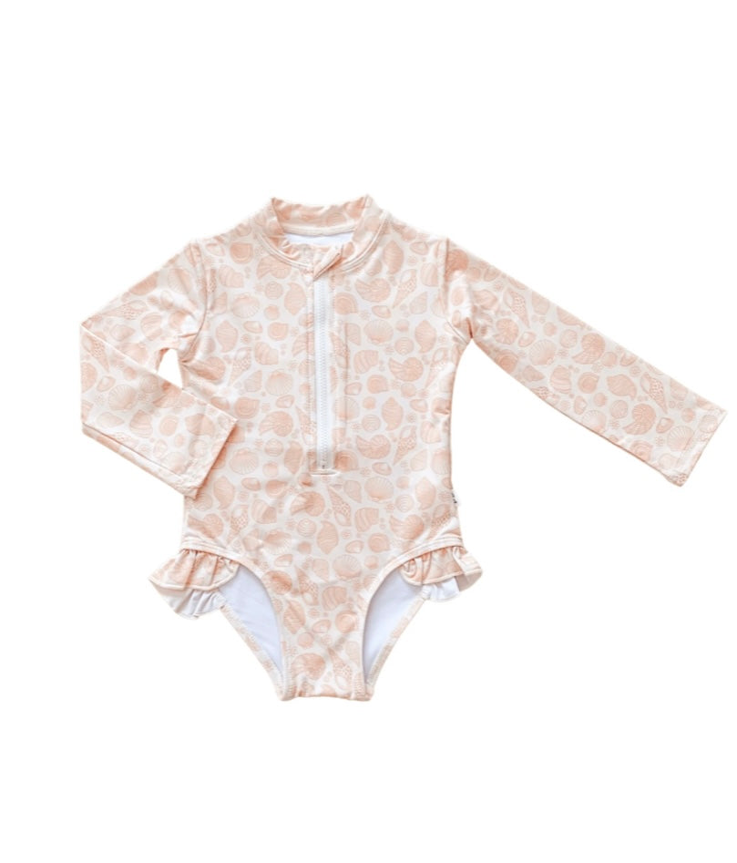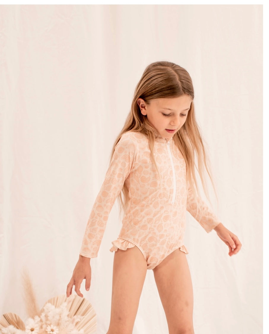 Beautiful long sleeve swimsuit featuring zip down the front and the sweetest little leg ruffles in our stunning Peach Seashell print.