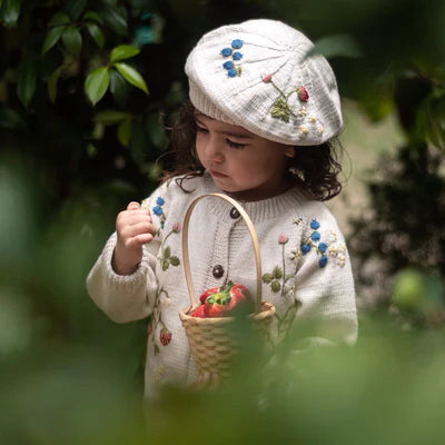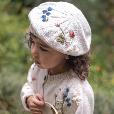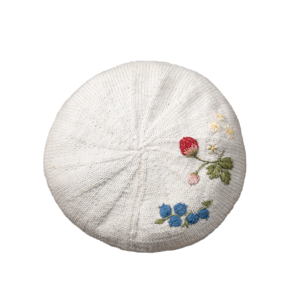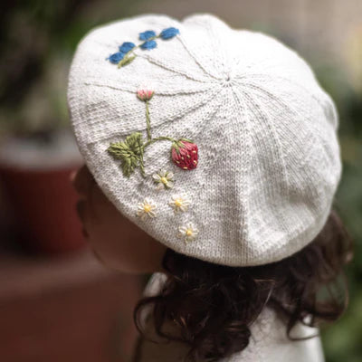 The beret is available in two beautiful colorways, each shade serves as the perfect backdrop for the sweet berry and garden embroideries. It is very comfortable and spacious. It can be worn slanted/the Parisian way or pulled down, if you prefer.