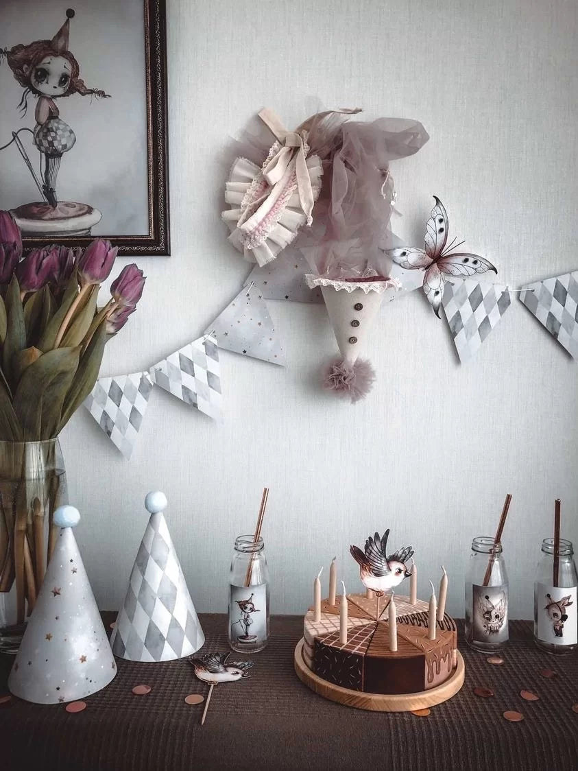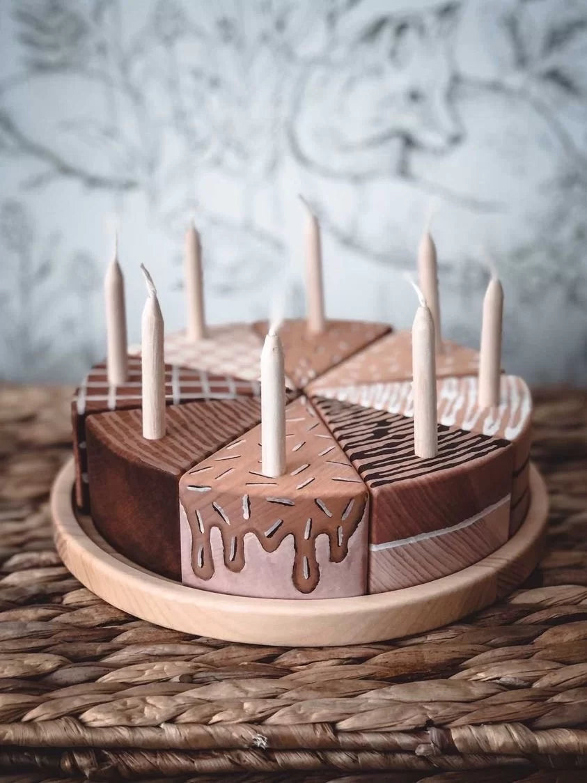 This wooden cake is a really fun toy for children to play with. Made of cedar wood, it is finished with paints certified safe for children's toys. The diameter of the cake is 18 cm, and it includes a wooden dish. The cake consists of eight pieces, each with a candle, and none of the patterns is repeated. The three "flavours" are Chocolate, Vanilla and Pistachio. Enjoy!